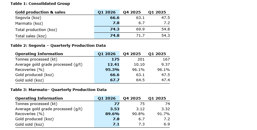 Neil Woodyer, chair and chief executive officer, commented: "Our strong start to 2026 reflects both solid operating performance and a supportive gold price environment. We expect Q1 2026 gold revenue to exceed $360-million, a significant increase from $154-million in Q1 2025 and $301-million in Q4 2025, driven by higher gold prices and increased ounces sold. Looking ahead, we expect production growth in 2026 to be weighted toward the second half of the year, with first gold from the Marmato CIP plant on track for Q4 and a continued steady ramp-up at Segovia."
