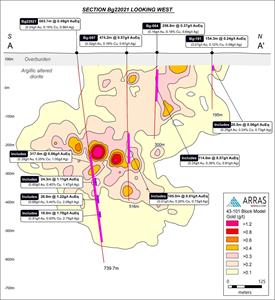 Figure 4. Cross-section showing drill holes Bg22021 in relation to historical drill hole Bg-084, Bg-097 and Bg-101. Also shown are grade contours based on the Beskauga block model for gold (only) developed for the purposes of the current Mineral Resource Estimate for Beskauga (for further details, please see Arras’ press release on June 20, 2022). AuEq grades of key intercepts in Bg22012 and historical holes are shown. The cross-section demonstrates the steep, southwest dipping high-grade copper-gold-silver trend observed through Arras’ exploration to date. This trend is observed beginning at the paleo-bedrock surface (41 m in depth), to average between 200-300 m wide and to be consistently mineralized down to at least 1000 meters.