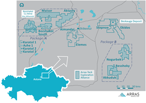 Arras’s License Package showing Arras-Teck Strategic Alliance Areas as “Package A” and “Package B” as well as the Elemes, Aimandai, Stepnoe, & Ekidos licences which are 100% owned by Arras.