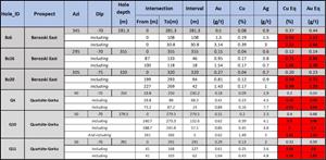 Notes: Copper Equivalent (“CuEq”) grades reported for the drill holes at Quartzite Gorka were calculated using the following formula: CuEq % = Copper (%) + (Gold (g/t) x 0.8264) + (Silver (g/t) x 0.0107) + (Molybdenum (ppm) x 6.0000). Gold Equivalent (“AuEq”) grades reported for the drill holes at Quartzite Gorka were calculated using the following formula: AuEq g/t = Gold (g/t) + (Copper (%) x 1.2100) + (Silver (g/t) x 0.0129) + (Molybdenum (ppm) x 4.0334). Assumptions used for the copper and gold equivalent calculations were metal prices of US$3.00/lb. Copper, US$1,700/oz Gold, US$22/oz Silver, US$18/lb. Molybdenum, and metallurgical recoveries were assumed to be 90% for Cu and Au and 50% for Ag and Mo. Intervals are core-length weighted and original core recovery is estimated to be > 90 %.