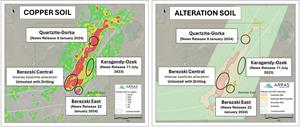 Figure 3. Soil anomaly maps showing copper results and the alteration map. Also shown are the locations of the re-assayed drillholes located at Quartzite-Gorka and Berezski East as well as Karagandy-Ozek, a high-grade gold-silver epithermal zone. The intensely altered Berezski Central zone is also shown which is co-incident with the 2.8 kilometer x 1.6 kilometer molybdenum soil anomaly (see figure 4).