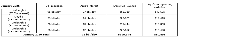 Argo Gold Inc.'s January, 2026, oil production was 2,254 barrels, averaging 73 barrels per day. Oil prices averaged $57 per barrel, and Argo's oil revenue was $129,344 and net operating cash flow was $80,891.