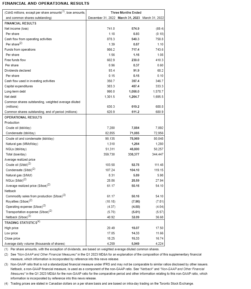 ARC Resources Ltd. has released its first quarter 2023 financial and operational results, has noted the sanctioning of Attachie phase I, has provided revisions to its 2023 guidance, and has increased the dividend.