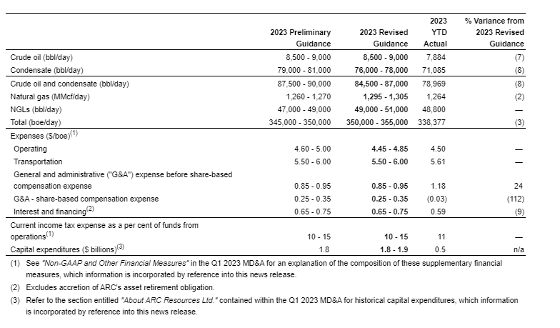 - ARC increased production guidance in 2023 to average between 350,000 and 355,000 boe per day (previously 345,000 to 350,000 boe per day). The increase reflects stronger than forecast production from its base assets.