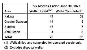 Capital expenditures in the second quarter registered at $417-million. ARC drilled 32 wells and completed 49 wells during the second quarter, focused mainly at Kakwa and Sunrise. Other investment focused on completing the Sunrise facility expansion, turnaround activity at Kakwa, and the electrification of the Dawson III and IV facilities.