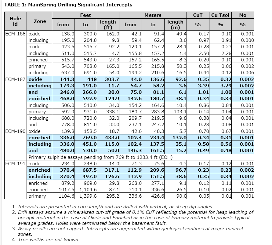 ECM-190: 433 ft (132 m) at 0.34 per cent CuT (total copper), 0.31 per cent Cu TSol (total soluble copper) from 336 ft (102 m) depth (enriched);