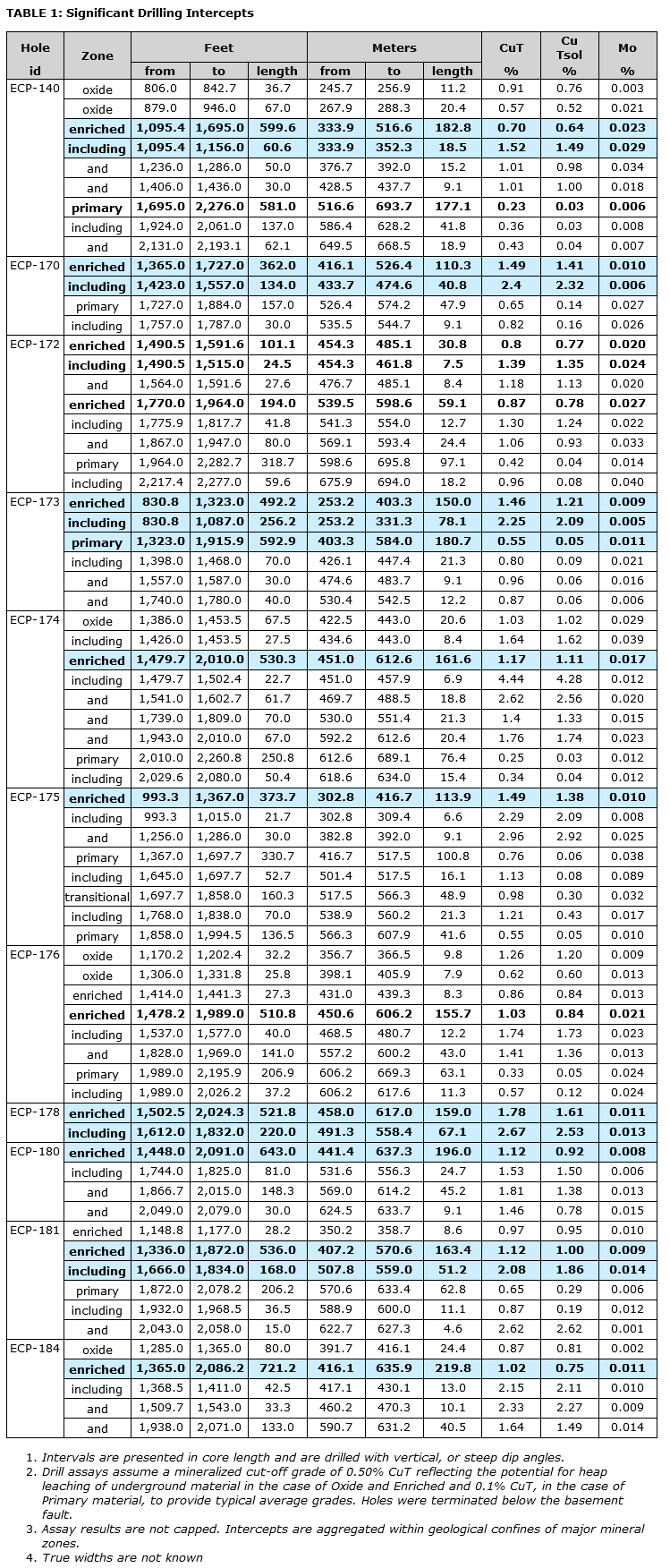 - ECP-180: 884 feet (269 m) of 0.91 per cent CuT, 0.77 per cent Cu TSol and 0.007 per cent Mo (enriched) of continuous mineralization: