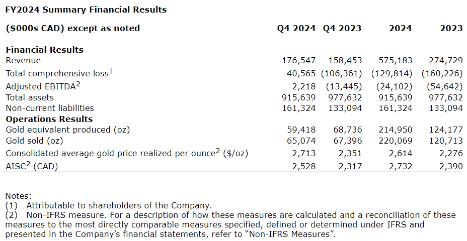 In Q4 2024, the company achieved positive adjusted EBITDA (earnings before interest, taxes, depreciation and amortization) and comprehensive income for the first time, positively impacted by a higher realized gold price and reversal of provisions.