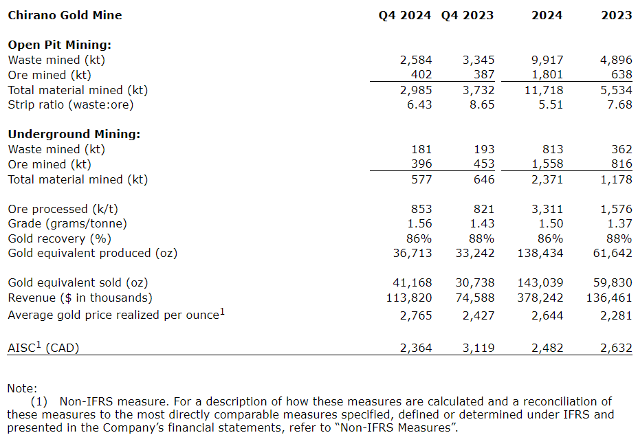 Results for Q4 2024 continued to be impacted by the aforementioned factors, resulting in reported gold recovery of 69 per cent and AISC of $2,811 per ounce.