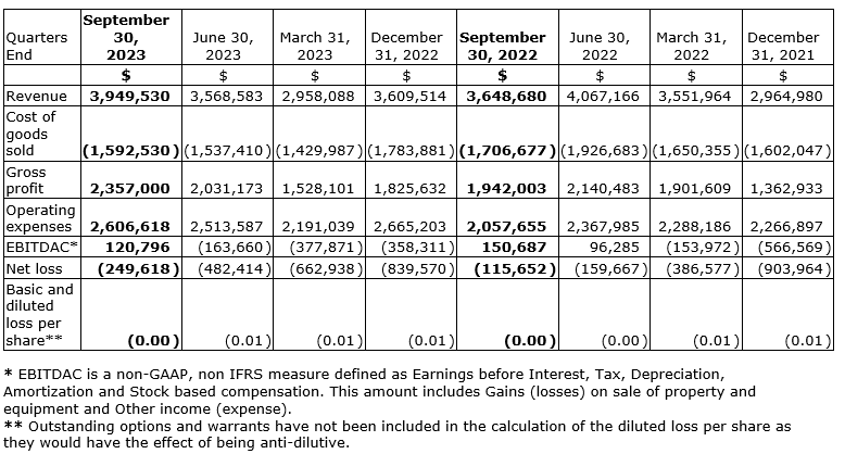 Positive EBITDAC (earnings before interest, tax, depreciation, amortization and stock based compensation): the company had positive EBITDAC of $120,796 in Q3 2023 compared with ($163,660), ($378,871) and ($358,311) in the three previous quarters.