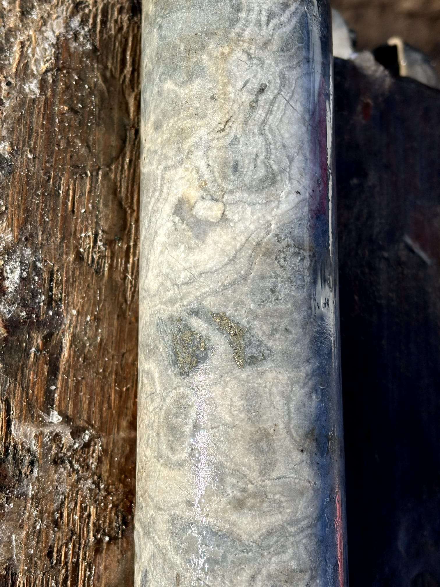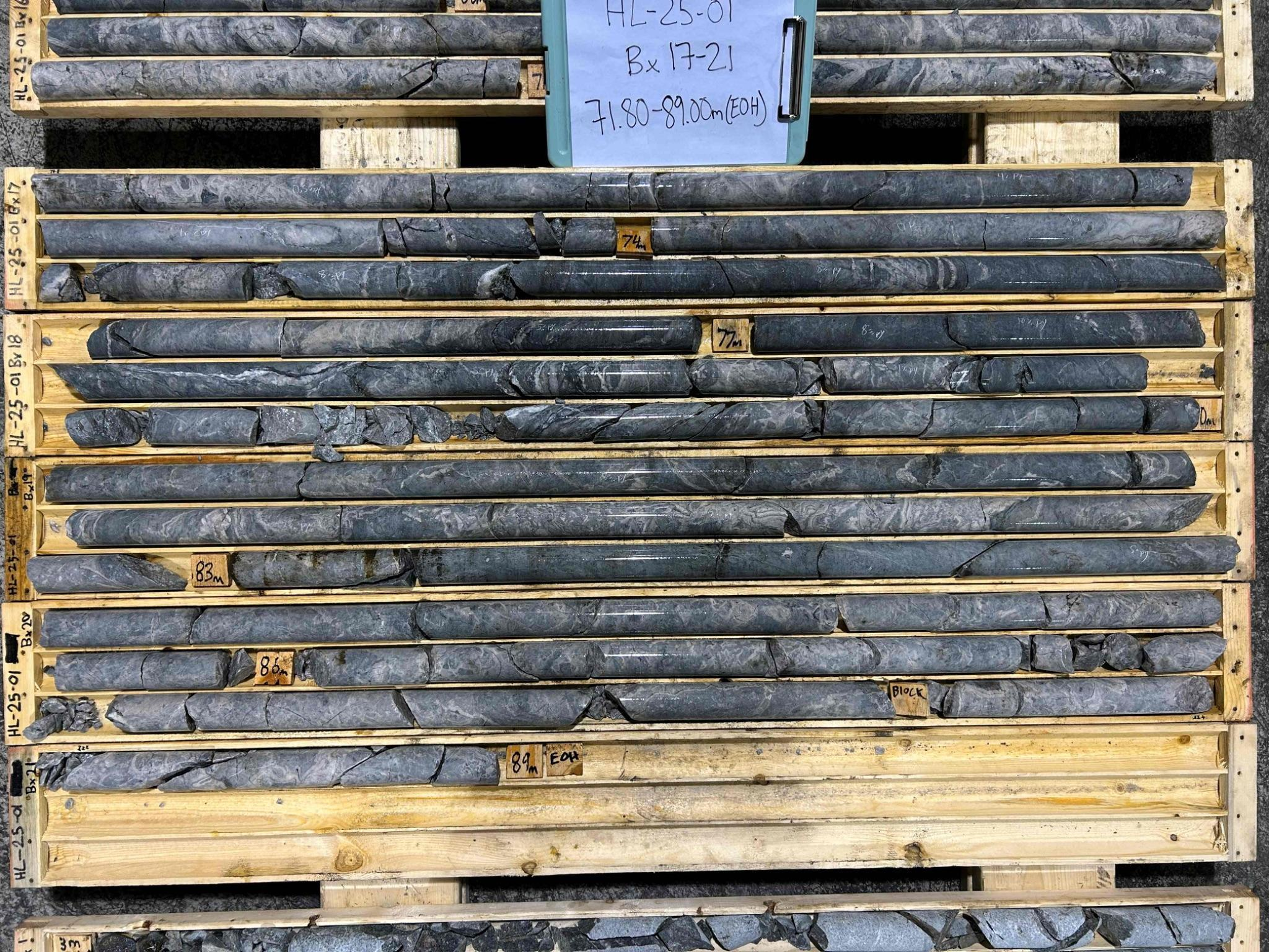 In early fall, the historic core from 1987 was located, cut and assayed, returning 0.33 g/t Au over 25.74m in proximity to the Twilight Zone (October 14, 2025).