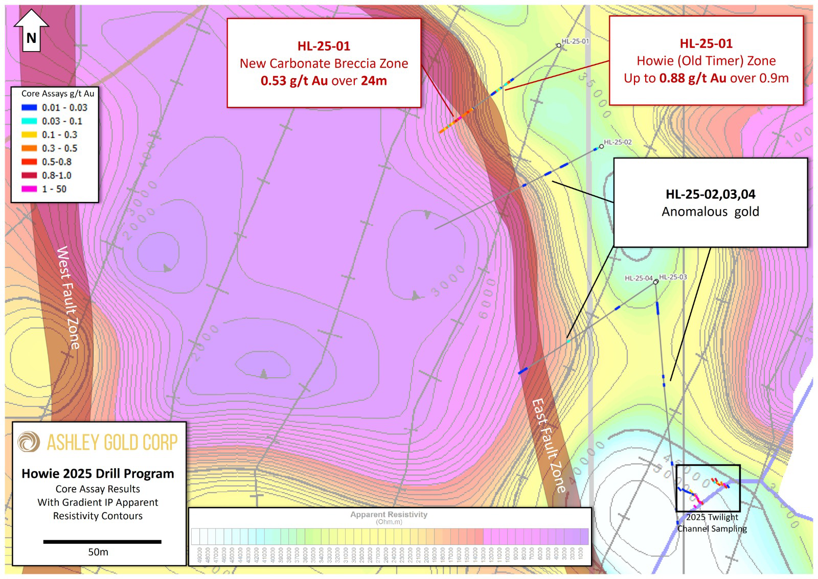 The targets were selected using the IP survey data commissioned in 2024, with results received in 2025. The 2025 drill program probed the highest gold index, along a trend of coinciding chargeability and resistivity, now dubbed the “Twilight-Gap Zone”.