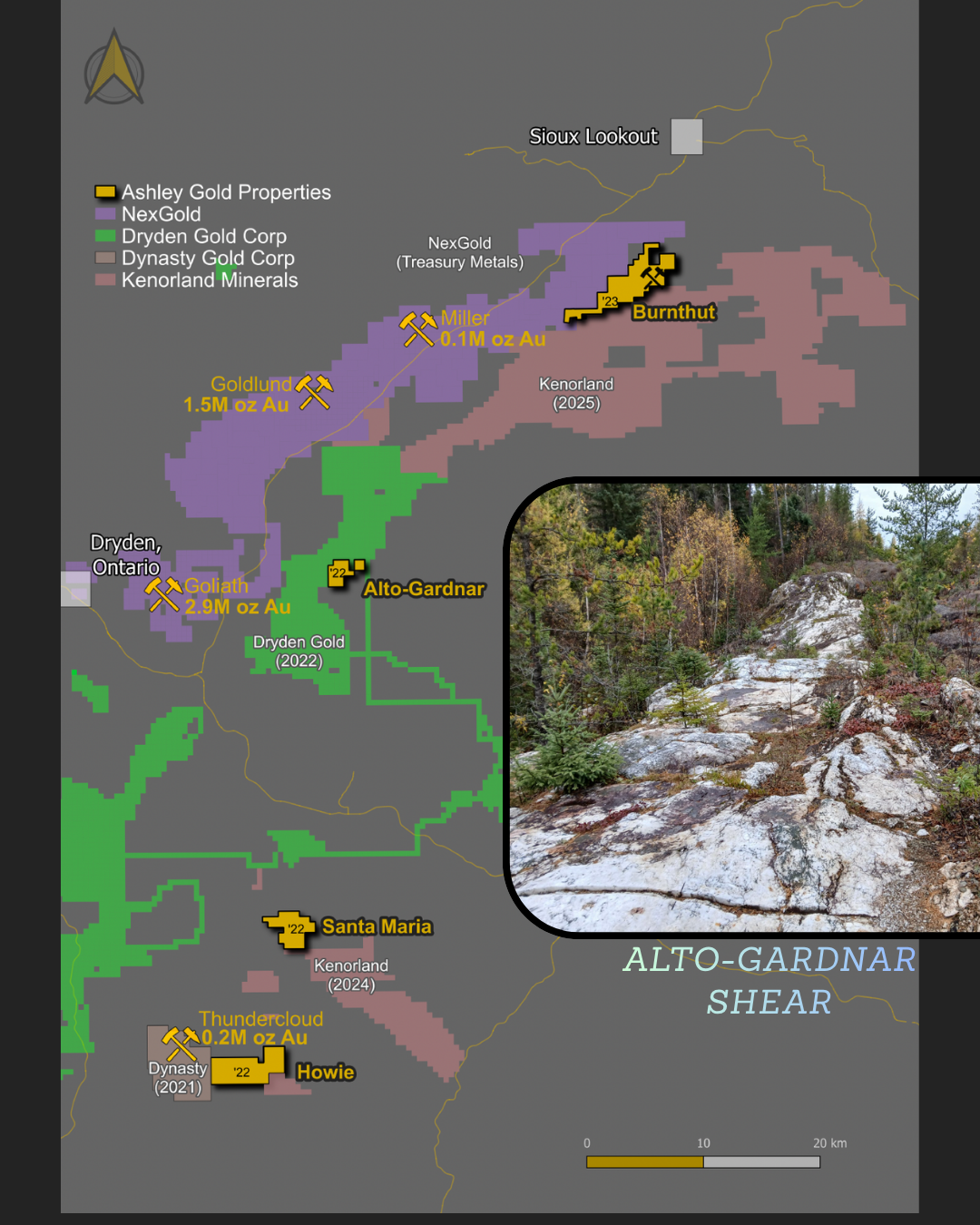 Ashley Gold Corp. is a Canadian mineral exploration company focused on acquiring and developing highly prospective gold and polymetallic deposits in Canada’s top mining regions. The Company’s flagship assets are in the Dryden Area in Ontario with a 100% ownership in Santa-Maria, Burnthut (including the Tak Patents), Howie, Alto-Gardnar claims as well as in British Columbia with the Icefield Portfolio having two highly prospective claim packages.
