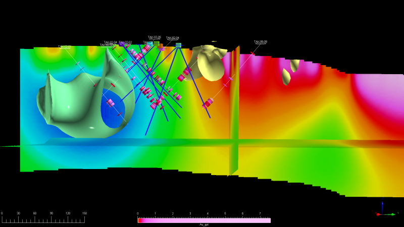 Image 1: Tak Drill Plan Section - Looking WSW - Res 20k ohm - CHG 30ms - Au >0.1 g/t