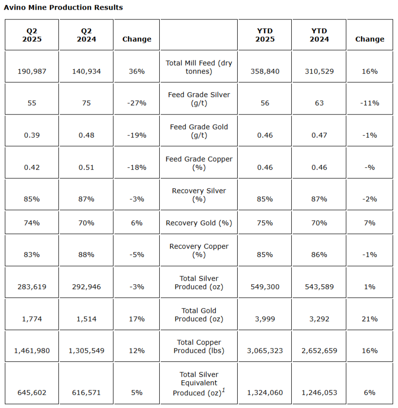 - Copper production increased 12 per cent: Avino produced 1.5 million pounds of copper in Q2 2025, a 12-per-cent increase compared with Q2 2024.