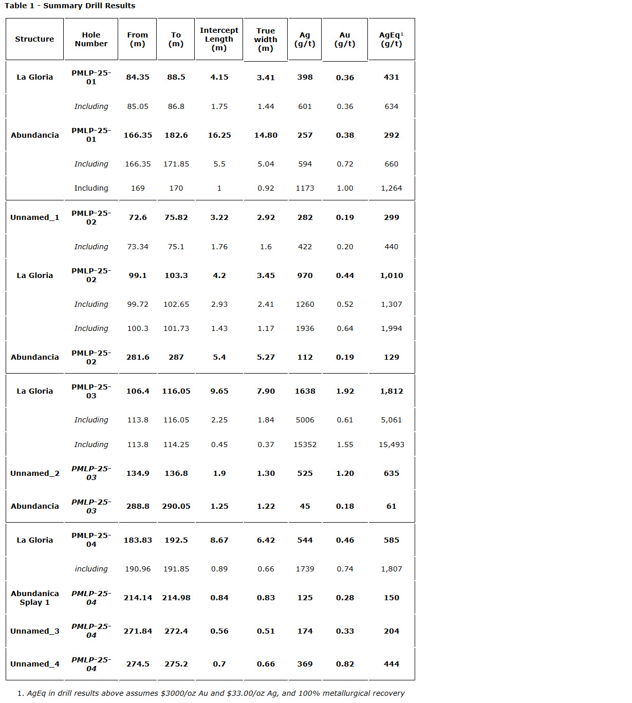 - Hole PMLP 25-04: 544 g/t Ag and 0.46 g/t Au over 6.42 metres true width: