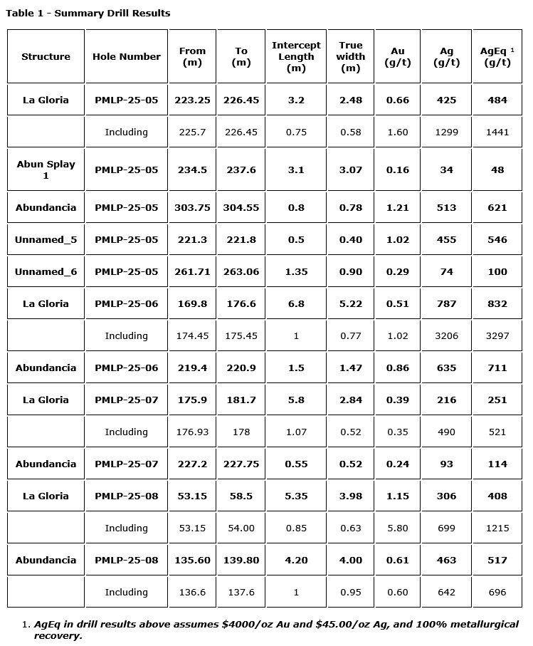 - Hole PMLP 25-08 at Gloria: 306 g/t Ag and 1.15 g/t Au over 3.98 metres true width: