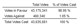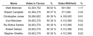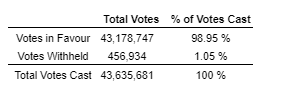 A total of 43,635,681 common shares were voted at the meeting, representing 32.98 per cent of the votes attached to all outstanding common shares of the company. All matters presented for shareholder approval at the meeting were duly authorized and approved as follows: