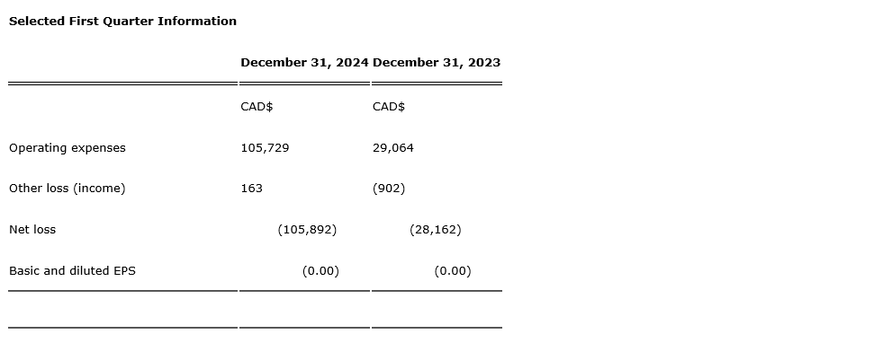 • Net loss of $105,892 for the three months ended Dec. 31, 2025 (Dec. 31, 2024 -- net loss of $28,162), an increase of 70 per cent from FY (fiscal year) 2025;