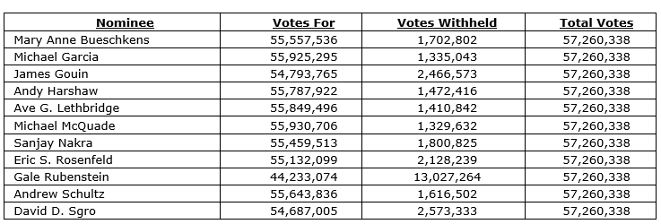 All of the nominees listed in the management information circular prepared in connection with the meeting were elected as directors of the company. The company received proxies and virtual votes at the meeting as set out in the attached table.