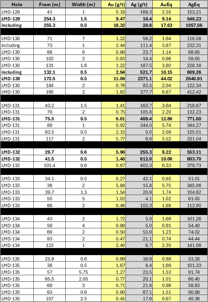 - LMD-132: 0.6 metre grading 255.3 g/t silver and 5.96 g/t gold: