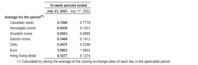 The attached table highlights certain information regarding the company's operations for the 12-week periods ended July 23, 2023, and July 17, 2022, and the results analysis in this section should be read in conjunction with this table. The results from the company's operations in Europe and Asia are presented together as Europe and other regions.