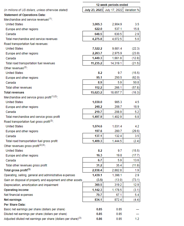 The company's revenues were $15.6-billion for the first quarter of fiscal 2024, down by $3.0-billion, a decrease of 16.3 per cent compared with the corresponding quarter of fiscal 2023. This decrease is mainly attributable to a lower average road transportation fuel selling price as well as the net negative impact of approximately $118.0-million from the translation of the company's foreign currency operations into United States dollars, while being partly offset by the contribution from acquisitions, higher road transportation fuel demand as well as organic growth of the company's convenience activities.