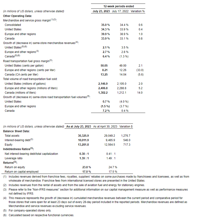 Total merchandise and service revenues for the first quarter of fiscal 2024 were $4.3-billion, an increase of $203.3-million compared with the corresponding quarter of fiscal 2023. The translation of the company's foreign currency operations into United States dollars had a net negative impact of approximately $25.0-million. The remaining increase of approximately $228.0-million, or 5.6 per cent, is primarily attributable to organic growth, and to the contribution from acquisitions which amounted to approximately $52.0-million. Same-store merchandise revenues increased by 2.1 per cent in the United States, by 2.7 per cent in Europe and other regions, and by 6.4 per cent in Canada, driven by the company's diversified offer in the beverage category as well as the continued growth of its Fresh Food, Fast program and private brands.