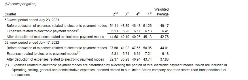 The road transportation fuel gross margin of Couche-Tard's company-operated stores in the United States and the impact of expenses related to electronic payment modes for the last eight quarters, were as shown in the attached table.