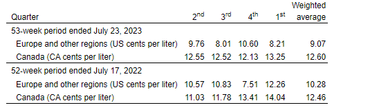 - Road transportation fuel gross margin of 50.05 cents per gallon in the United States, an increase of 1.05 cents per gallon, and of 13.25 Canadian cents per litre in Canada, a decrease of 79 Canadian cents per liter. Fuel margins remained healthy throughout the North American network, due to favourable market conditions and the continued work on the optimization of the supply chain. In Europe and other regions, the road transportation fuel margin was 8.21 cents per litre, a decrease of 4.05 cents per litre, mostly driven by the volatility of the global fuel market, more impactful to the corporation's European gross margin due to a more integrated supply chain model in this region.