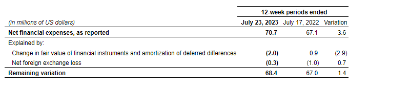 Net financial expenses for the first quarter of fiscal 2024 were $70.7-million, an increase of $3.6-million compared with the corresponding period of fiscal 2023. A portion of the increase is explained by certain items that are not considered indicative of future trends, as shown in the attached table.