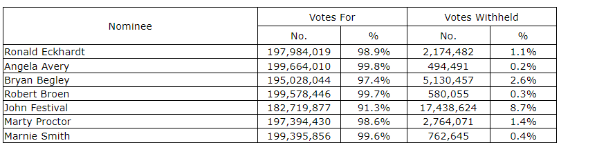 The results of the voting, inclusive of all votes cast and proxies received for each director nominee, which was conducted by ballot, are as shown in the attached table.