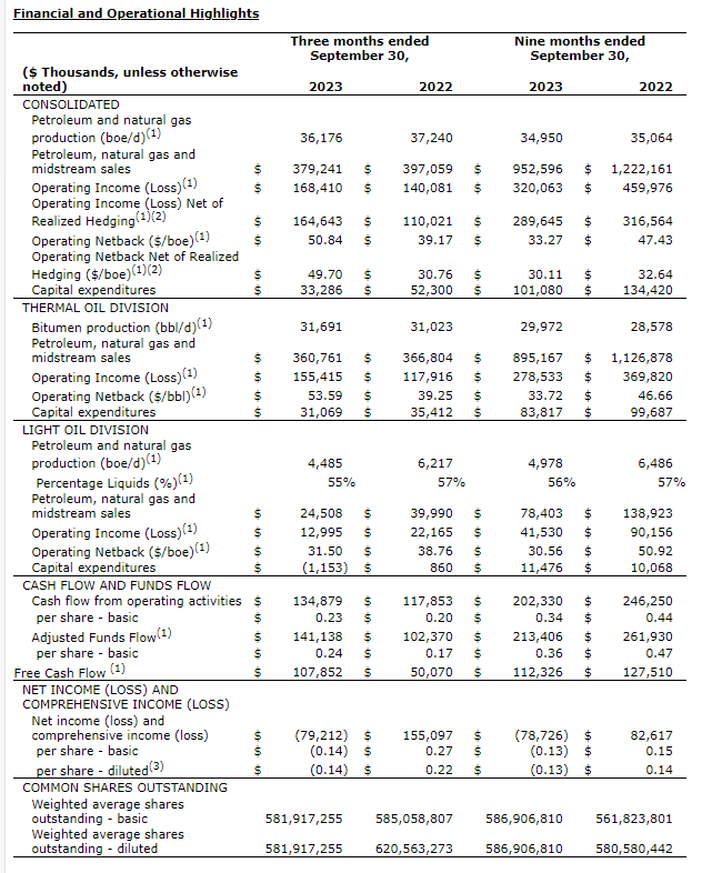 Bitumen production for the third quarter of 2023 averaged 31,691 bbl/d. The thermal oil division generated operating income of $155-million (operating netbacks -- $55/bbl at Leismer and $48/bbl at Hangingstone) during the period with capital expenditures of $31-million, primarily related to well completions and progressing the facility expansion at Leismer.