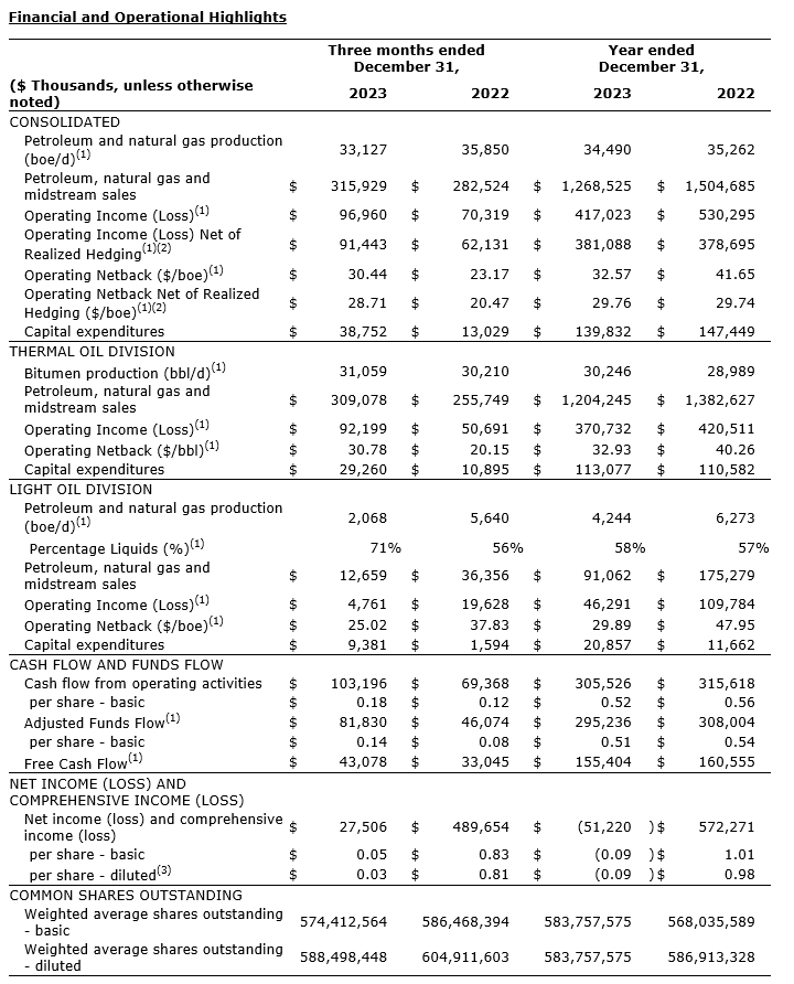 - Capital program: $140-million, below annual guidance of $145-million, with $99-million invested at its cornerstone Leismer asset focused on advancing the expansion project with growth expected to 28,000 barrels per day (bbl/d) by midyear 2024;