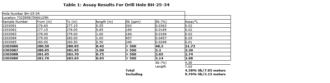 • Drill hole BH-25-34 returned antimony assays of 4.38 per cent antimony (Sb) over 7.05 metres (m), including 9.76 per cent Sb over 3.15 metres.
