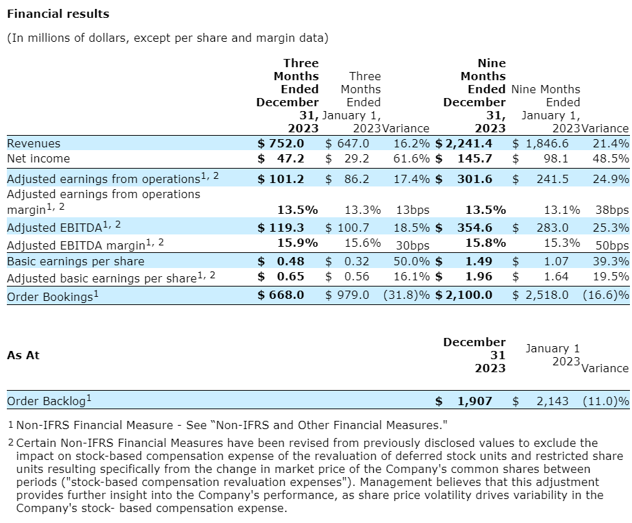 EBITDA was $113.7-million (15.1-per-cent EBITDA margin) in the third quarter of fiscal 2024, compared with $83.9-million (13-per-cent EBITDA margin) in the third quarter of fiscal 2023. EBITDA for the third quarter of fiscal 2024 included $16.2-million of restructuring charges, $900,000 of incremental costs related to acquisition activity, $800,000 of acquisition-related fair value adjustments to acquired inventories, a $600,000 recovery of stock-based compensation expenses due to revaluation and an $11.7-million gain on sale of facilities. EBITDA for the corresponding period in the prior year included $700,000 of incremental costs related to acquisition activity, $10.5-million of restructuring charges and $5.6-million of stock-based compensation revaluation expenses. Excluding these costs, adjusted EBITDA was $119.3-million (15.9-per-cent adjusted EBITDA margin), compared with $100.7-million (15.6-per-cent adjusted EBITDA margin) for the corresponding period in the prior year. Higher adjusted EBITDA reflected higher revenues, partially offset by increased SG&A expenses. EBITDA is a non-IFRS (international financial reporting standards) measure.