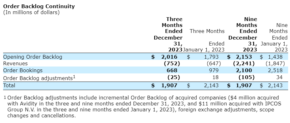At Dec. 31, 2023, order backlog was $1,907-million, 11 per cent lower than at Jan. 1, 2023, primarily on account of lower order backlog within the transportation market where several large, strategic order bookings were included a year ago.