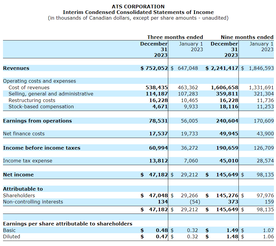ATS Corp. has released its financial results for the three and nine months ended Dec. 31, 2023.
