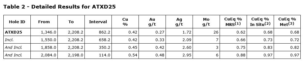 Additionally, ATXD25 ended in 114 metres of 0.88% CuEq(1) (0.54% Cu, 0.48 g/t Au, 2.95 g/t Ag and 6 g/t Mo), within a broader interval of 350.2 metres grading 0.75% CuEq (0.45% Cu, 0.42 g/t Au, 2.60 g/t Ag and 3 g/t Mo) from 1,858m.