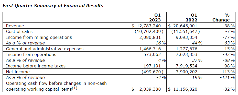 Sales for the quarter decreased 38 per cent to $12.8-million when compared with $20.6-million in Q1 2022. Copper (Cu) and gold (Au) accounted for 84 per cent and 16 per cent of the 6,475 (Q1 2022 -- 9,568) dry metric tonnes (DMT) sold during Q1 2023. Sales during the quarter were impacted by lower quantities sold and at a lower copper price compared with Q1 2022.