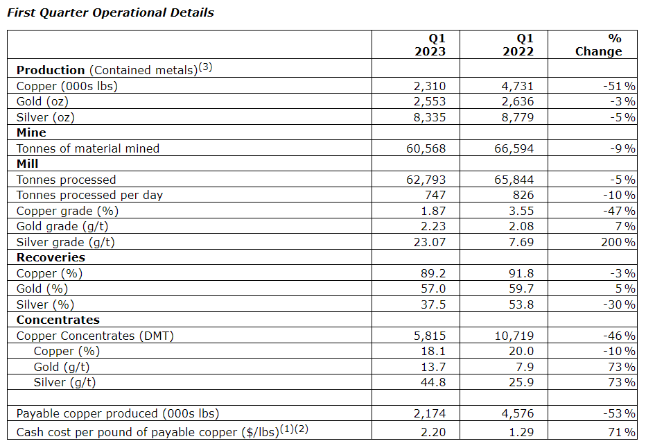 In Q1 2023, the company produced 2.3 Mlb of copper, 2,553 oz of gold and 8,335 oz of silver. The decrease in copper production is mainly due to the decrease in grade.