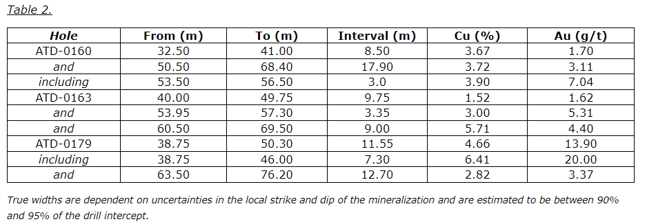 "We are pleased to report that our mine vicinity drill campaign continues to intercept mineralization and extends the main historic massive sulphide body at the El Roble deposit. This area was mined by operators previous to Atico obtaining control of the mine on Nov. 22, 2013," said Fernando E. Ganoza, chief executive officer. "These results continue to increase confidence in our view that additional high-grade copper and gold mineralization remains both within the historically defined bodies and beyond the previously outlined mineralized shell. These strong assay results are open at depth and along strike and we will continue the drill program in this vicinity and into the second half of the year at which time the company plans to update the resource estimate."