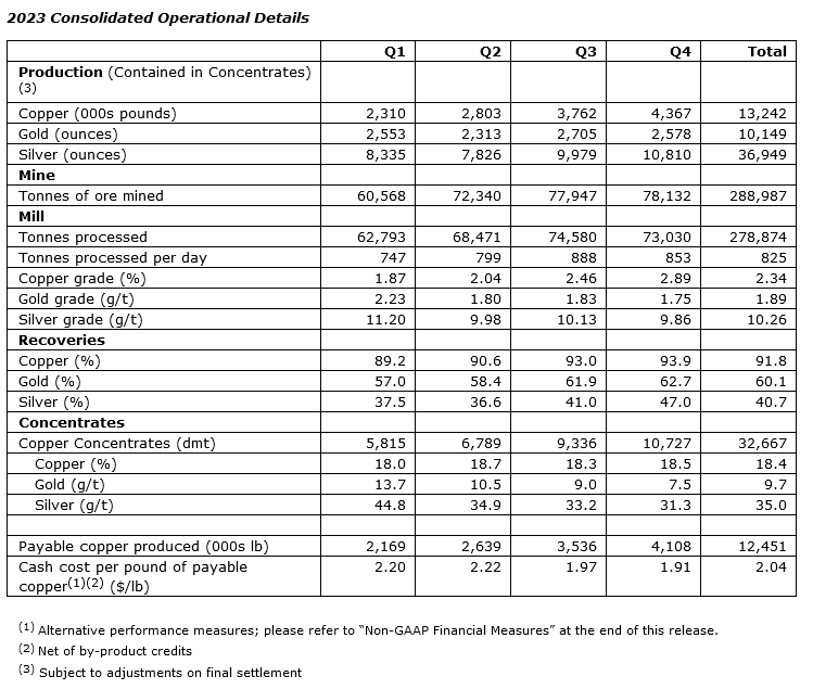 During the quarter, the company generated sales of $17.3 million, where copper accounted for 89 per cent and gold for 11 per cent. The average realized price per metal was $3.86 per pound of copper and $2,053 per ounce of gold, and included copper and gold price adjustments on shipments provisionally invoiced in prior quarters whose final settlement occurred during Q4-2023 as per their quotational periods. Income from mining operations for the quarter was $2.3 million and net cash provided by operating activities amounted to $3.5 million, which included operating cash inflows before changes in non-cash operating working capital items of $2.0 million and cash inflows from changes in non-cash working capital items of $1.5 million. Cash costs for the quarter were $135.00 per tonne of processed ore and $1.91 per pound of payable copper produced(2)