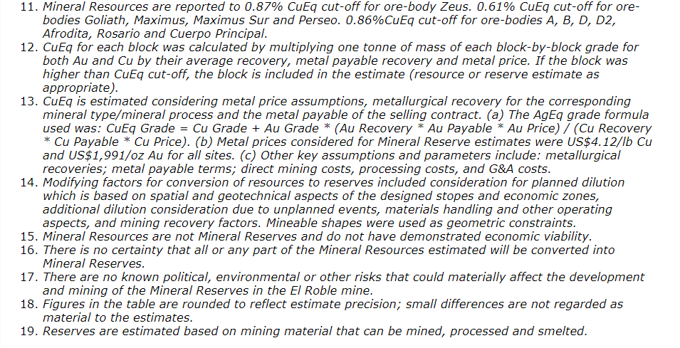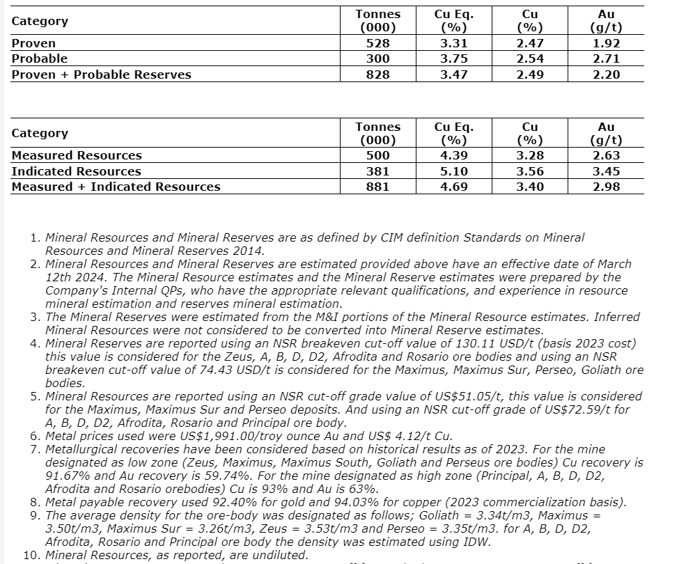 El Roble has proven and probable reserves of 828,000 tonnes grading 2.49 per cent copper and 2.20 g/t gold, at a cut-off grade of 2 per cent copper equivalent; this value is considered for the Zeus, A, B, D, D2, Afrodita and Rosario orebodies and 1.1 per cent is considered for the Maximus, Maximus Sur, Perseo and Goliath orebodies as of March 12,, 2024. Mineralization is open at depth and along strike and the company plans to further test the limits of the deposit.
