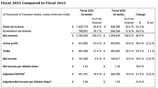 Drove continued momentum in e-commerce, increasing revenue by 36.4 per cent on top of 32.5-per-cent growth in fiscal 2022 and 88.3-per-cent growth in fiscal 2021, comprising 35.1 per cent of net revenue in fiscal 2023;