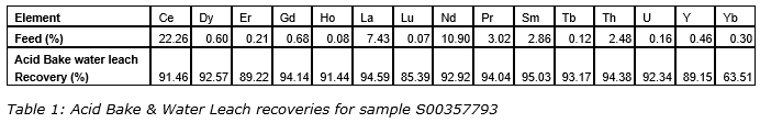 - The amended National Instrument 43-101 report indicates a representative 3.2-tonne bulk sample taken from two locations on the Area 50 pit. Acid bake testing of the bulk sample concentrate, sample No. S00357793, was done in March, 2022, at IGS Impact Global Solutions' laboratory. The results produced a total rare earth oxide concentrate totalling 49 per cent with recoveries averaging 89.74 per cent as provided in the attached table. In this same test, IGS was able to precipitate 94.38 per cent of the thorium and 92.34 per cent of the uranium, both radioactive elements. IGS is confident it can precipitate greater than 99 per cent of the thorium and 90 per cent to 95 per cent of the uranium. In conclusion, a straightforward production of rare earth bulk concentrate with only minor amounts of thorium and uranium was achieved at the lab-scale level using scalable and conventional processing technology of acid bake, water leach and precipitation steps. This is important because to transport the concentrates to North American or European refineries, the radioactive content must be less than 100 parts per million, which appears to be achievable.