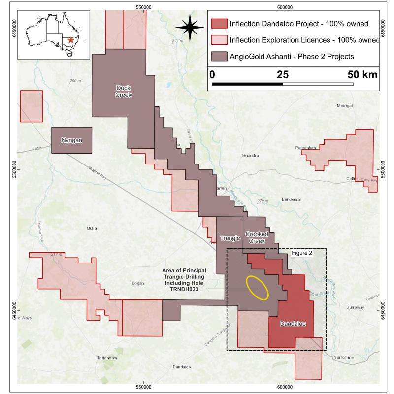 Figure 1: Location map showing Dandaloo Project relative to the Trangie and other Inflection exploration licenses and the projects included as part of Phase II of the AngloGold Ashanti Agreement.