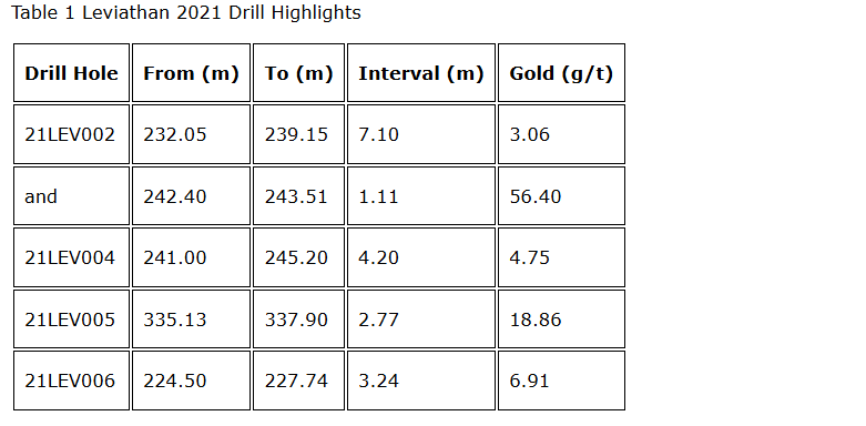 The second structural trend is the Leviathan-Mariner's trend (LMT), which covers three kilometres of historic workings. In 2021, Leviathan completed an eight-hole diamond drill program along a 270 m portion of the LMT targets. The drill program returned significant results from four of the eight drill holes, justifying further work.