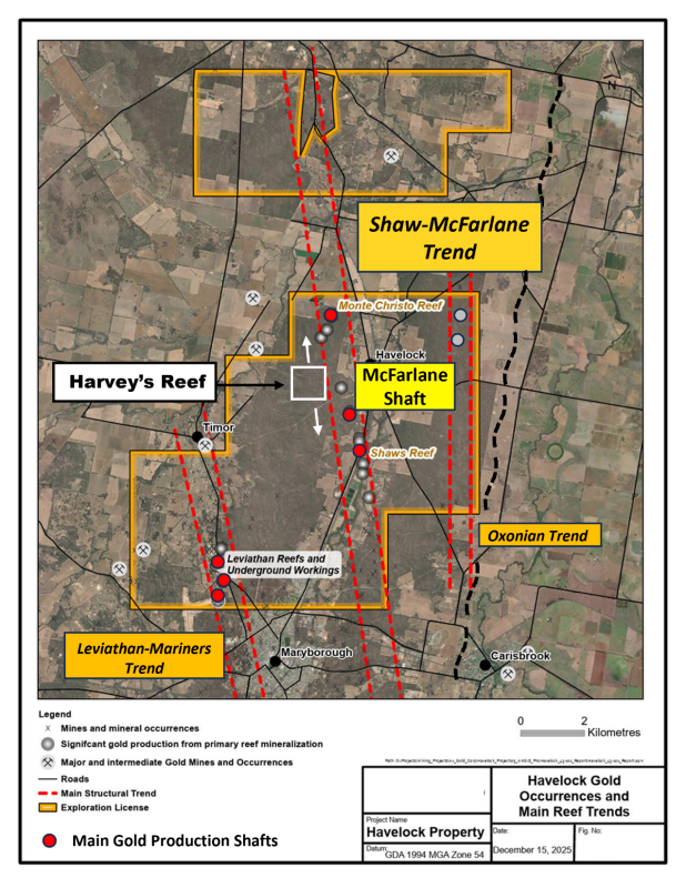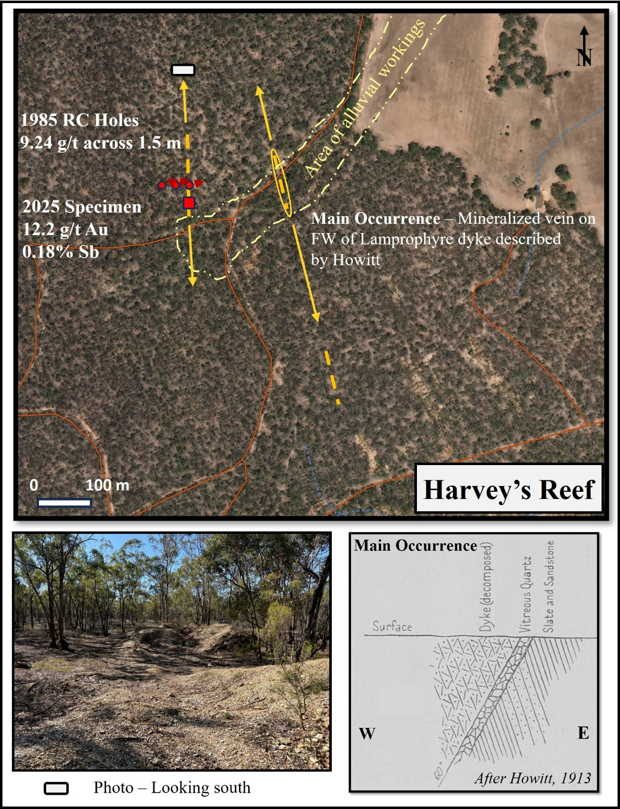 The main occurrence at Harvey’s Reef was discovered in 1906 and is described by Howitt (1913) as occurring “ directly on the wall of a large lamprophyre dyke (up to 5 m thick) striking N. 18° W and dipping 60° to 70° W. across the strata which dip east ”. The quartz vein averages 30 centimetres (“cm”) thick and is historically documented on both the dyke hanging-wall and footwall contacts. Gold grades of 1 oz per ton were reported from the hanging wall while greater than 1 oz per ton was reported from the footwall. Enhanced gold grades in the footwall portions of other veins in the district are observed in modern production settings. The main occurrence at Harvey’s Reef has only received limited exploration along strike and to shallow depths (18 m at the deepest) where the mineralization locally pinched and is described with a southerly plunge.