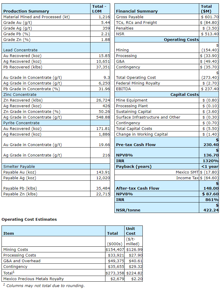 The discounted cash flows shown herein are prepared in compliance with National Instrument 43-101. There is no certainty that the economic results described herein will be realized. If the company is able to obtain sufficient capital and restart production at the Velardena properties, the company would do so without completing customary feasibility studies demonstrating the economic viability of the project. A mine production decision that is made without a feasibility study carries additional potential risks, which include, but are not limited to: (i) increased uncertainty as to projected initial and sustaining capital costs and operating costs, rates of production, and average grades; and (ii) the inclusion of inferred mineral resources, as defined by NI 43-101, that are considered too geologically speculative to have the economic considerations applied to them that would enable them to be converted to a mineral reserve, as defined by NI 43-101. Mine design and mining schedules, metallurgical flow sheets, and process plant designs may require additional detailed work and economic analysis and internal studies to ensure satisfactory operational conditions and decisions regarding future targeted production.